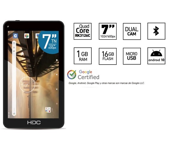 Multitouch 7. SO: Android 10. WiFi. BT. USB. Proces RK3126C Quad Core de 1.2 -- Ghz. Memoria Ram 1 Gb. Almac. 16 Gb. Micro SD. Resolucion 1024 x 600. Cámara frontal: 0.3 MP. Cámara trasera: 2.0 MP. WI-FI: 802.11 B/G/N. BLUETOOTH: Sí. MEDIDAS: 190 x 108 x 10.5 mm. Funda de silicona de regalo en color verde.