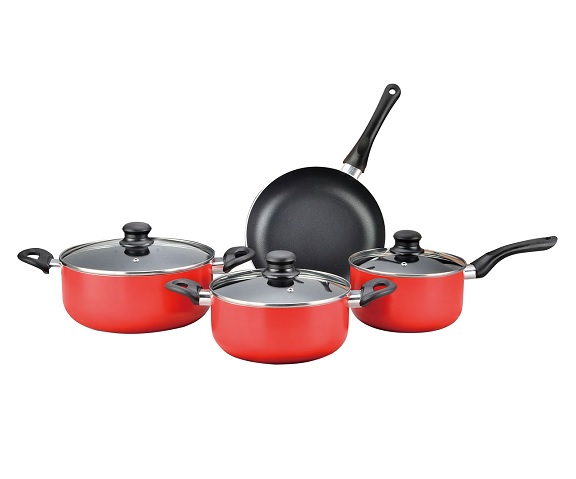 Set de cocina de 7 Piezas - Incluye: Una cacerola de 24 cm con tapa, Una cacerola de 20 cm con tapa, Una cacerola de 16 cm con tapa y Una sarten de 24 cm - Posee un recubrimiento antiadherente de alta calidad - Tapas de VIDRIO TEMPLADO con Vaporizador y contorno de ACERO - Apto para cocinas a gas, eléctricas, cerámica y lavavajilla - Apto para horno hasta 180 grados - Mango de baquelita ergonomico y resistente al calor. Color: rojo