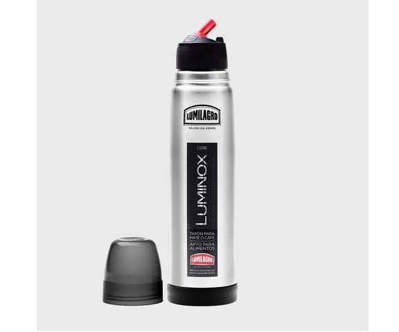 Su doble pared de acero inoxidable y el proceso de vacío exclusivo garantiza una alta performance del producto y asegura el mantenimiento de temperatura por muchas horas. Tapón para mate o café. Mantiene contenido frío o calor : 12 h. Tipo bala. Con vacío interno. Con pared doble de aislamiento. Dimensiones: Altura 33 Cm. // Diámetro 9 Cm. . Material: Acero Inoxidable /interior y exterior. Sistema de apertura de tapa con pico vertedor Lumilagro. Capacidad: 1 litro. Para líquidos fríos y calientes. Presentación en caja.Tapa plástica. IMPORTANTE: En los termos, no se recomienda colocar lácteos ni derivados, tampoco comidas para bebé / Son productos perecederos y pueden desarrollar bacterias.